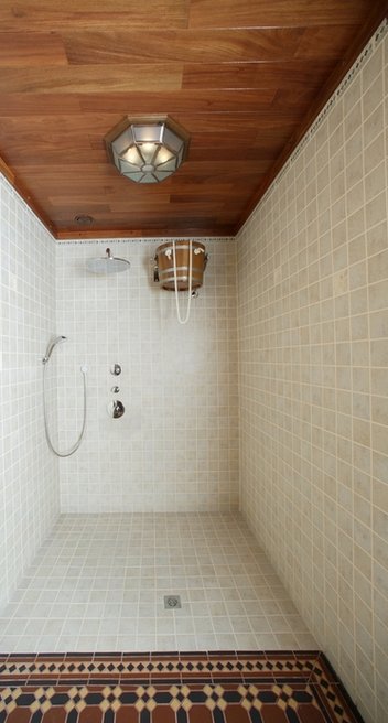 Поработают дизайнеры и над интерьером помывочного отделения: керамическая плитка украсит стены, керамогранит – пол. Уместно применить в отделке разнообразную мозаику, смальту для создания роскошных интерьеров.